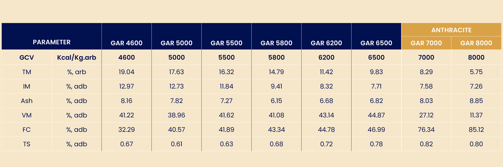 We have coal with various specifications following standards ranging from Anthracite, ICI 1, ICI 2, ICI 3, ICI 4, and ICI 5.
